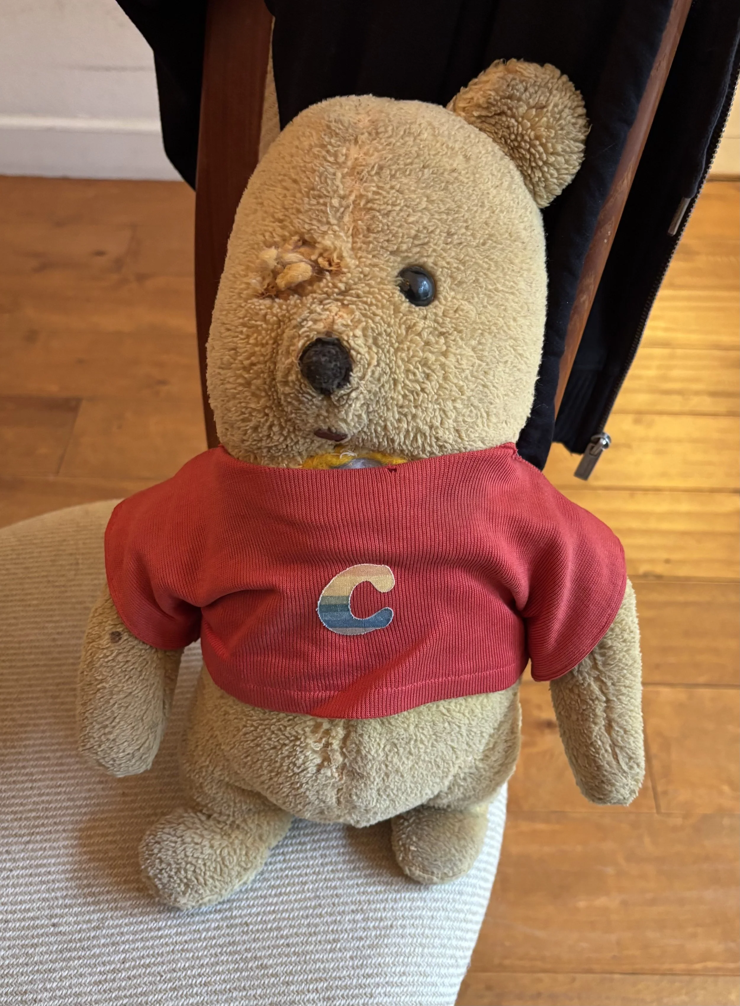 I met my friend back in 1982, when we both started at Vassar College, living in the same ancient dorm building. My friend had a single while I had a roommate, so we often ended up in her dorm room. Winnie was ensconced on her bed, and spent many nights being loved and tormented by our college friends. One friend took great glee in throwing Winnie high in the air – not a clue why, but I do recall repairing that friend’s Snoopy lovie, which had sprouted a hole in his neck. His air-tossing days were well behind him, so possibly Winnie became a substitute for her fun.