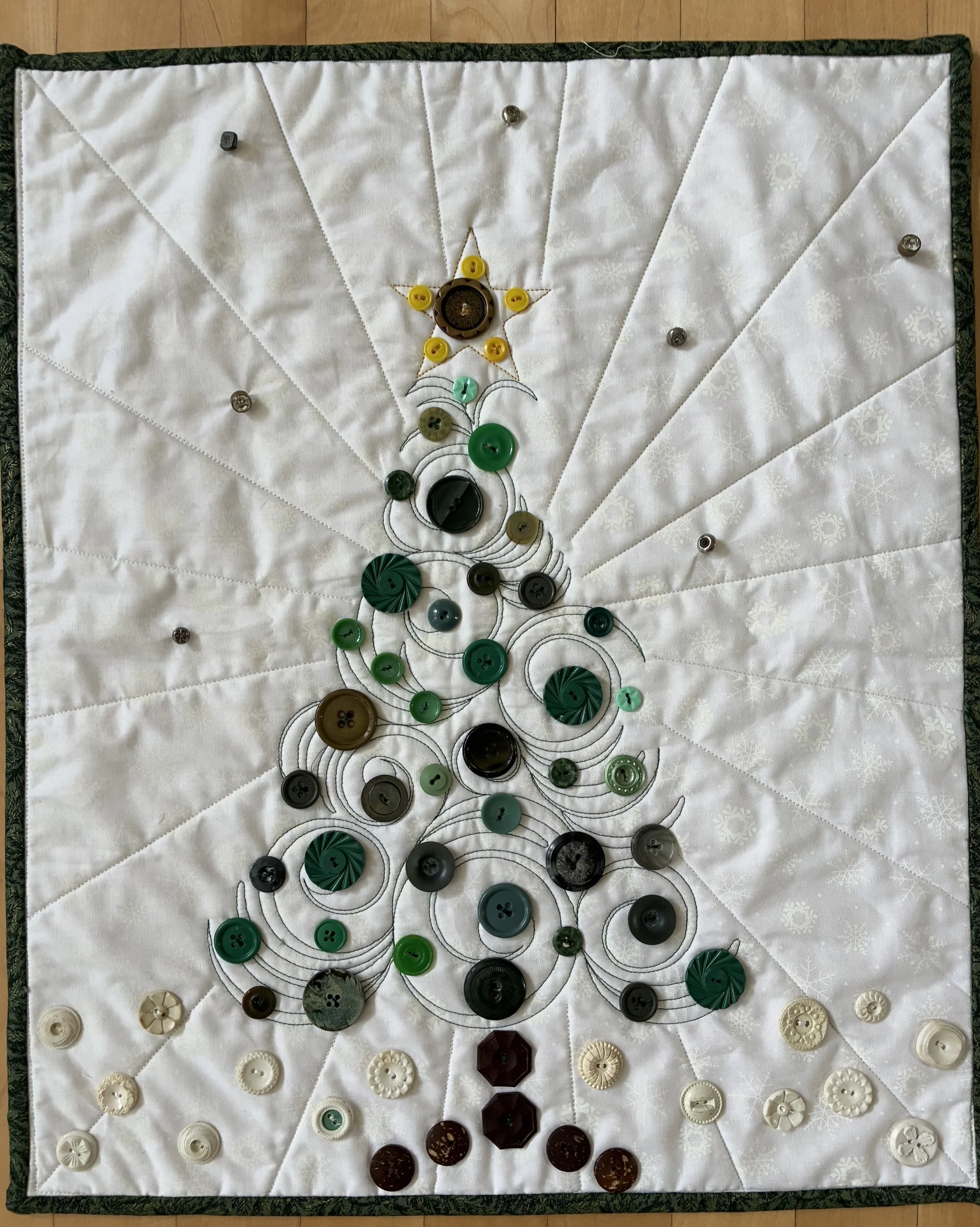 Last year my local quilt guild held a quilt show, and I was helping with the ‘Silent Auction’ fundraiser. Guild members make small quilted items for show attendees to bid on, and the auction is a great money maker. One member donated a few ‘sample quilting’ projects, and this small holiday tree was one. However, the piece needed a bit of sprucing up as it was only the quilted image on the white background. I decided to add buttons to the tree.