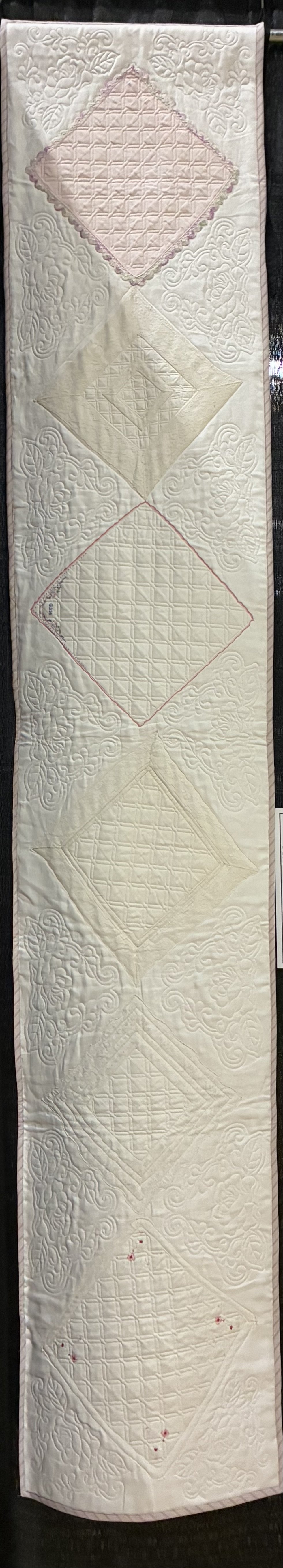 Back in December of 2023, my first official quilt ‘client’ was a local woman who had a collection of her grandmother’s hankies. She wanted a long table runner made with them as a Christmas gift for her parents. I liked the idea so much I used heirloom handkerchiefs passed down from my father’s relatives and made a similar table runner. I used a vintage linen tablecloth as the background, and a dear friend offered to quilt it. She did a lovely job, highlighting each hankie with detailed quilting in white thread so all you see are the lovely designs amid the heirloom hankies. My table runner is long and narrow to suit a farm table in our dining room, but honestly given it is a white linen I have been hesitant to use it. Guests may have to sign a blood oath they won’t spill on it: no hankie-panky around my treasure please.