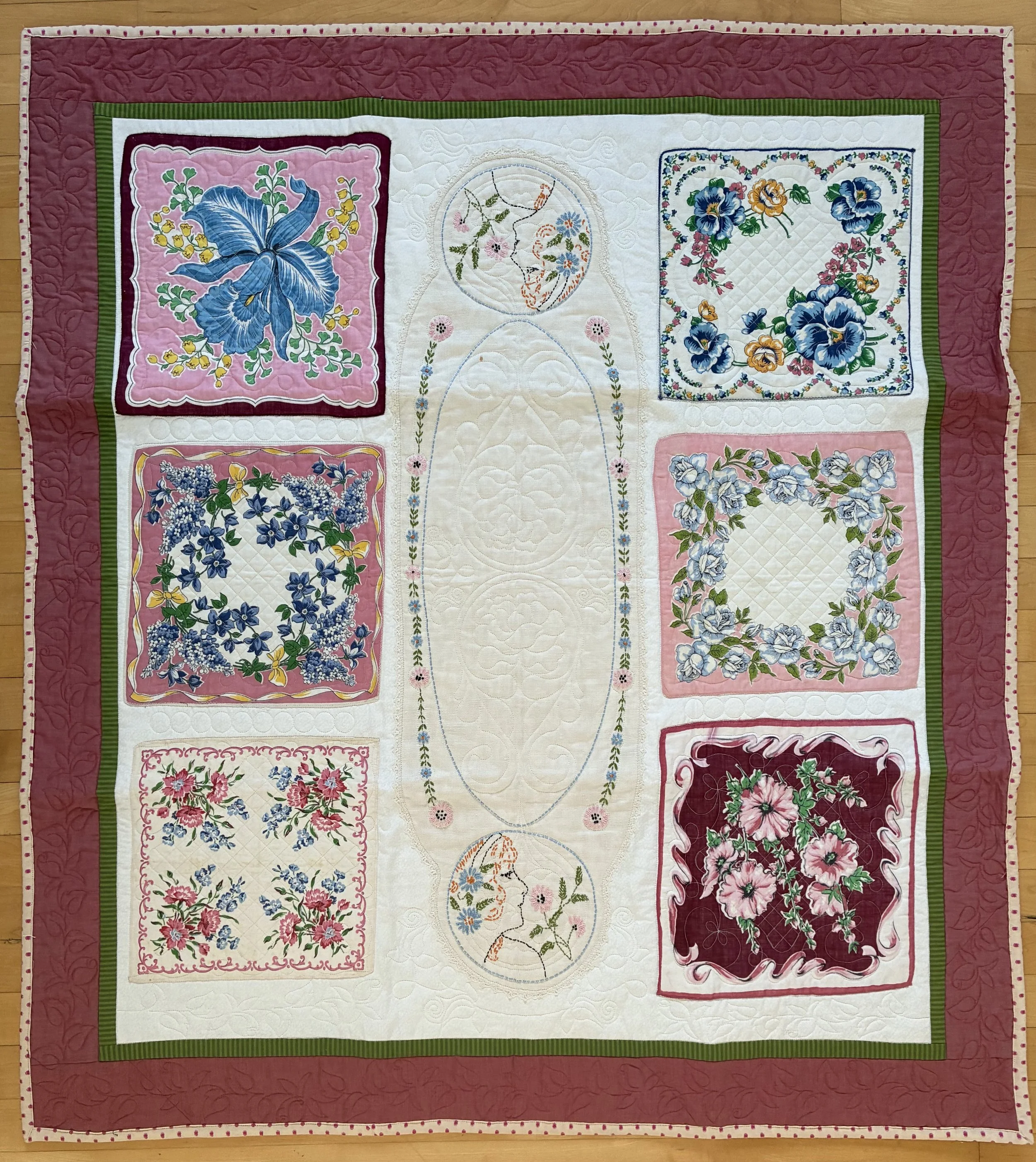 Awhile back I was asked to give a talk about my vintage finds and quilting projects. It morphed into a show and tell of the wonderful treasures I have found thrifting, and how I use them in quilt and sewing projects. I have a quilted table runner made from family heirloom antique hankies but it wasn’t available for my talk. As I wanted to discuss what you can do with all those vintage family treasures you have ferreted away in drawers, I needed an example to share. This quilt was my solution. I dug through the piles of vintage linens and hankies I have collected, thrifted a man’s dress shirt for the rose border fabric, and had a professional quilter finish it for me.