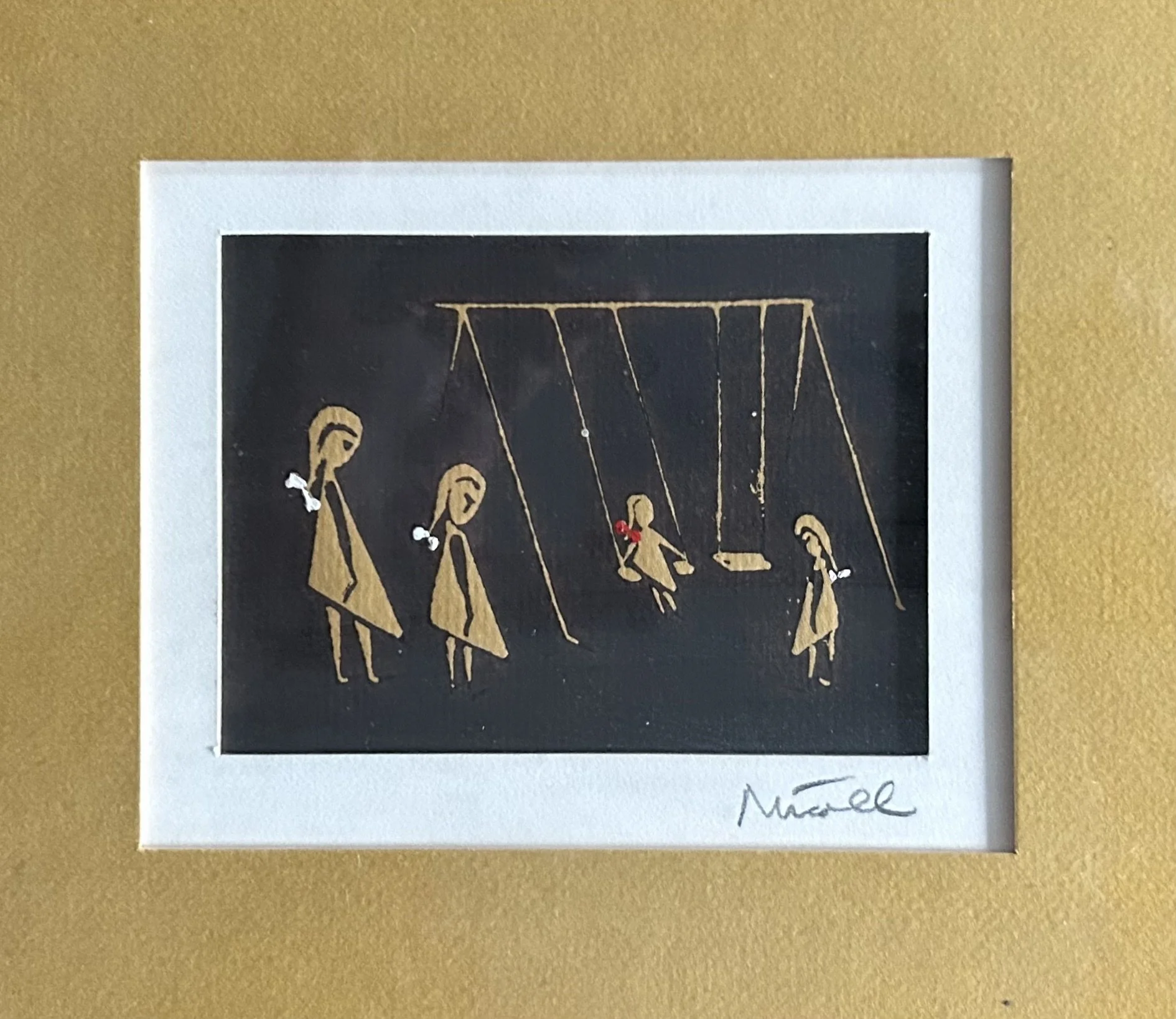 The work is a painting, and is very clever. Nicoll used the golden matt, also used in the framing, and inked over it to sketch out the image. The bows in the girls’ hair are added with dots of paint. Her style is very midcentury modern, and is remarkably expressive for such minimal use of paint. Somehow, with only a few lines, we can sense the swings moving, the girls eyeing their little sister, and the young red bowed girl sitting smugly on her swing. Today is Monday, I am rather busy these days doing all sorts of things, but come Friday, I am sure I will again turn to introspective moments as I enjoy lovely vintage artwork.