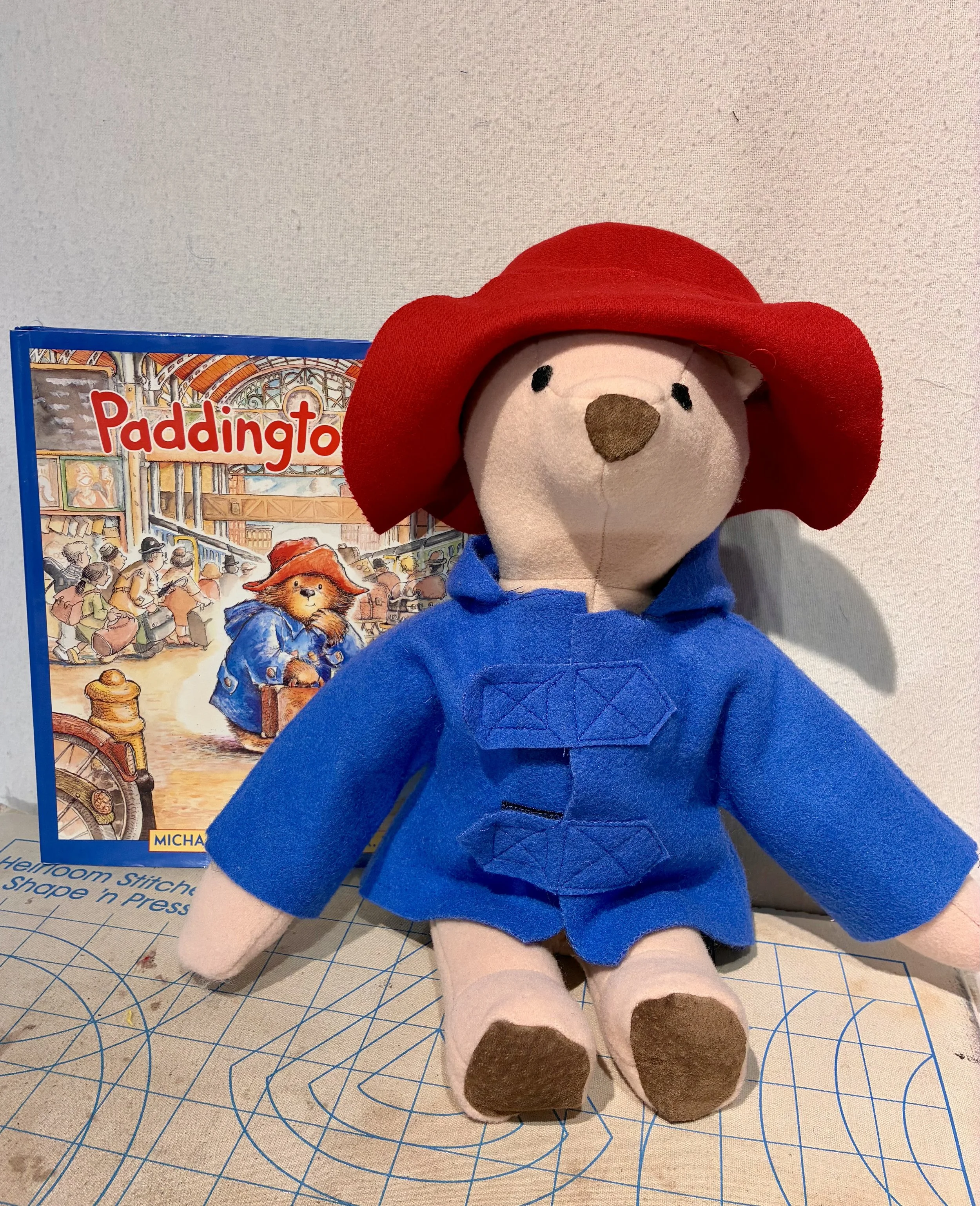 While mulling ideas for my granddaughter’s first birthday gift, I thrifted a hardback Paddington Bear book, a 1998 edition in celebration of Paddington’s 40th birthday. Inspiration struck! I dug out my pattern, and started plotting my creation.