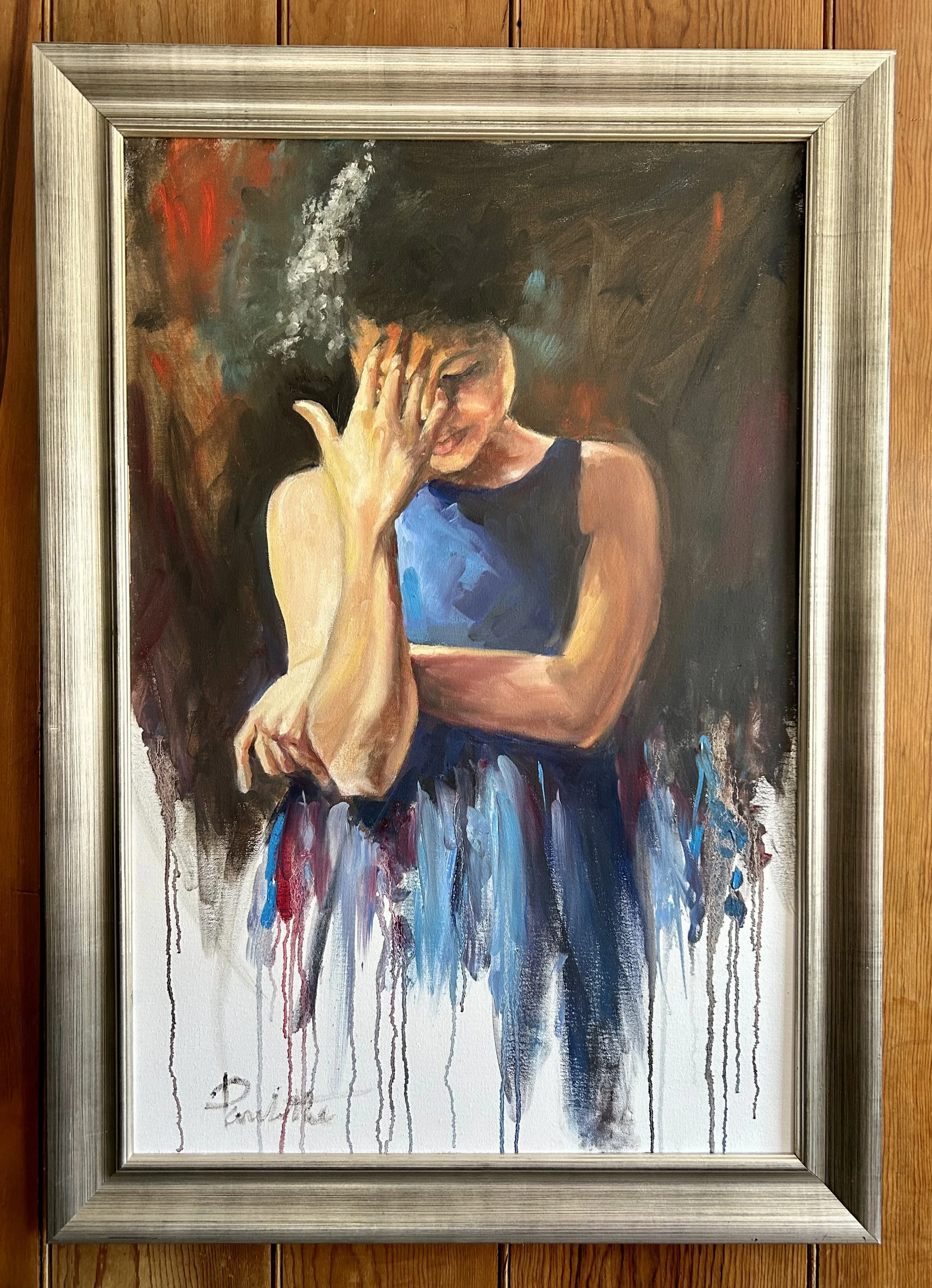 The composition of Bearing the Weight is timeless. Nothing really places it in a specific time, or location, and the model’s skin tone is ambiguous. The artist, Paulette, told me the woman was an art class model, and Paulette sketched her while she was taking a break from posing, not during the formal class session. The form is triangle in shape, and art history sees that blue draping as a classic “Madonna” color, often depicting the Virgin Mary wearing it, also frequently in a triangle form. The senses of sorrow and exhaustion the artist captures are striking, especially knowing we were all struggling through Covid-19 as well as Black Lives Matter concerns at that time. When my husband and I picked the painting up, there was a “Back the Blue” rally heading into the town to support police, in contrast to the Black Lives Matter events taking place. The model seems to carry the weight of those conflicts, and a sense of sorrow at the lack of civility in our society.