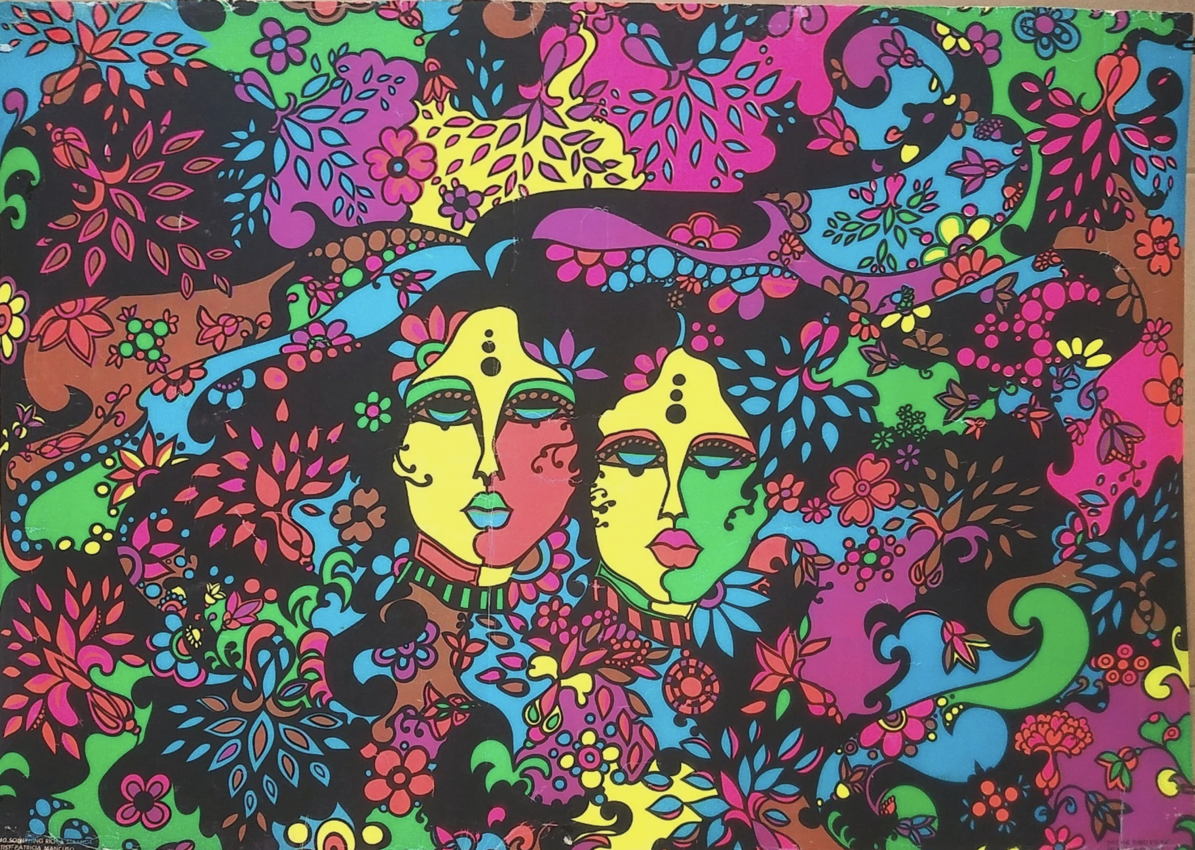 While recently visiting a dear friend, I showed her an image of the needlework, and she, being a theater buff, noted it reminded her of the “God Spell” artwork of the 1970s. Using that cue, AI image search immediately landed on a 1970 blacklight poster “Something Rich & Strange” by Patricia Mancuso. Bingo! I could not find a darn thing about the artist Patricia Mancuso, which I do find annoying (Peter Max, mind you, is easily researched). It is odd that even now, having had AI locate the Patricia Mancuso poster, if I search just the needlework it will not find her – indicating yet again that AI might be useful but it is not foolproof.