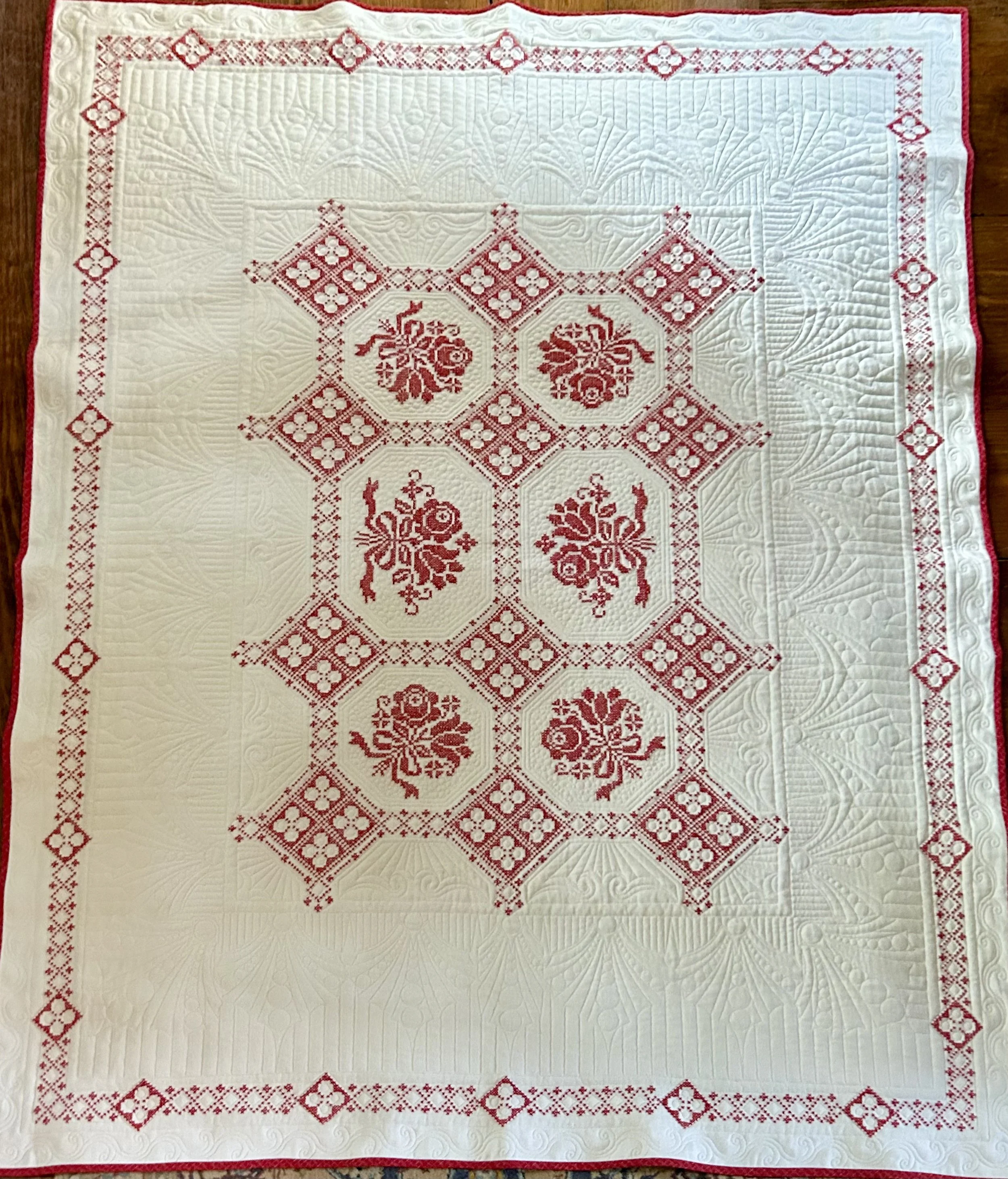 When I found this remarkable red work tablecloth, unused and then discarded, I thought it would make a lovely quilt. That said, there was not a chance in hell I would have time to hand quilt the piece – a process that is charming but so darn time consuming almost no quilter I know does so anymore. I could quilt it on my domestic sewing machine, but my skill doing so is rudimentary, and would not do the piece any justice. A dear friend who is a remarkably talented quilter offered to do the work for me on her long arm quilting machine. She did NOT have to ask me twice! How the heck she came up with the beautiful design and executed it so stunningly is beyond me. So now I feel rather guilty.